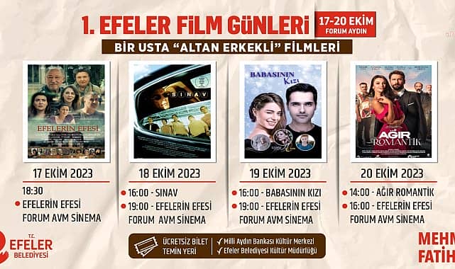 Efeler Belediyesi, 17-20 Ekim günleri arasında “1. Efeler Film Günleri”ne ev sahipliği yapmaya hazırlanıyor. Etkinlikte ilçeyi anlatan “Efelerin Efesi” filmi de gösterime sunulacak.Efeler Belediyesi, “1. Efeler Kitap Günleri”nin ardından bu kez de usta sanatçılar ve Efeler halkının desteğiyle “1.Efeler Film Günleri”ni düzenliyor. Şehrin öyküsünü beyaz perdeye taşıyan “Efelerin Efesi” isimli film de bu etkinlikte sinemaseverlerle buluşacak.Senaristliğini, yapımcılığını ve yönetmenliğini tiyatro ve sinema oyuncusu Veysel Diker’in üstlendiği, usta oyuncular; Altan Erkekli, Ayşegül Şamlıoğlu, Fulden Akyürek, Berrin Arısoy ve Hülya Şen’in yanı sıra Efeler Belediyesi Şehir Tiyatrosu oyuncuları ile yerel halktan bazı isimlerin birlikte rol aldığı “Efelerin Efesi” filmi, 17-20 Ekim günleri arasında Forum Aydın alışveriş merkezinde gerçekleştirilecek “1. Efeler Film Günleri”nde izleyicilerin beğenisine sunulacak.“1.Efeler Film Günleri”ne katılmak isteyenler, ücretsiz davetiyelerini Milli Aydın Bankası Kültür Merkezi ve Efeler Belediyesi Kültür ve Sosyal İşler Müdürlüğü’nden temin edebilecek.BAŞKAN ATAY SİNEMASEVERLERİ DAVET ETTİEfeler’in kültür ve sanatla anılan bir kent olması için çalışmalarını aralıksız sürdürdüğünü belirten Efeler Belediye Başkanı Mehmet Fatih Atay, tüm sinema meraklılarını, "1. Efeler Film Günleri"ne davet etti. Başkan Atay, “Efeler’in her alanda büyümesi, gelişmesi, kültür ve sanatla anılan bir şehir olması için elimizden gelen tüm çabayı çalışma arkadaşlarımla birlikte sarf ediyoruz. Ülkemizin saygın tiyatro emekçilerini konuk edeceğimiz ve ilçemizi konu alan ‘Efelerin Efesi’ filmini de yayınlayacağımız 1. Efeler Film Günleri’nde tüm sinemaseverlerle buluşmayı diliyorum” dedi.