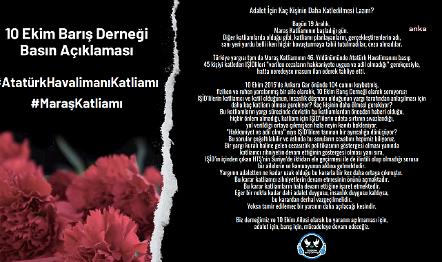 10 Ekim Barış Derneğinden yapılan yazılı açıklamada, Yargıtay’ın kararına tepki gösterdi. Açıklamada, şu ifadelere yer verildi:"Adalet İçin Kaç Kişinin Daha Katledilmesi Lazım?Bugün 19 Aralık. Maraş Katliamının başladığı gün. Diğer katliamlarda olduğu gibi, katliamı planlayanların, gerçekleştirenlerin adı, sanı yeri yurdu belli iken hiçbir kovuşturmaya tabii tutulmadılar, ceza almadılar. Türkiye yargısı tam da Maraş Katliamının 46. yıl dönümünde Atatürk Havalimanını basıp 45 kişiyi katleden IŞİDlileri 'verilen cezaların hakkaniyete uygun ve adil olmadığı' gerekçesiyle, hatta neredeyse masum ilan ederek tahliye etti. 10 Ekim 2015’de Ankara Gar önünde 104 canını kaybetmiş, fiziken ve ruhen yaralanmış bir aile olarak, 10 Ekim Barış Derneği olarak soruyoruz:IŞİD’lilerin katliamcı ve katil olduğunun, insanlık düşmanı olduğunun yargı tarafından anlaşılması için daha kaç katliam olması gerekiyor? Kaç kişinin daha ölmesi gerekiyor? Bu katliamların yargı sürecinde devletin bu katliamlardan önceden haberi olduğu, hiçbir önlem almadığı, katliam için IŞİD’lilerin adeta sırtının sıvazlandığı, yol verildiği ortaya çıkmışken hala neyin kanıtı bekleniyor. 'Hakkaniyet ve adil olma' niye IŞİD’lilere tanınan bir ayrıcalığa dönüşüyor? Bu sorular çoğaltılabilir ve aslında bu soruların cevabını hepimiz biliyoruz. Bir yargı kuralı haline gelen cezasızlık politikasının göstergesi olması yanında katliamcı zihniyetin devam ettiğinin göstergesi olması yanı sıra, IŞİD’in içinden çıkan HTŞ’nin Suriye’de iktidarı ele geçirmesi ile de ilintili olup olmadığı sorusu biz ailelerin ve kamuoyunun aklına gelmektedir.Yargının adaletten ne kadar uzak olduğu bu kararla bir kez daha ortaya çıkmıştır. Bu karar katliamcı zihniyetlerin devam etmesinin önünü açmaktadır. Bu karar katliamların hala devam ettiğine işaret etmektedir. Eğer bir nokta kadar dahi adalet duygusu, insanlık duygusu kaldıysa, bu karardan derhal vazgeçilmelidir. Yoksa tamir edilemez bir yaranın daha açılacağı kesindir. Biz derneğimiz ve 10 Ekim Ailesi olarak bu yaranın açılmaması için, adalet için, barış için, mücadeleye devam edeceğiz."