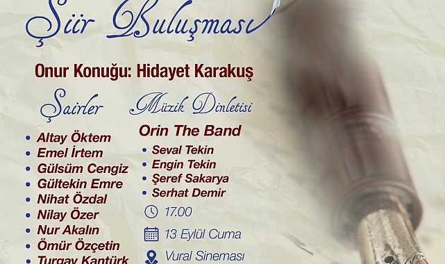 (BALIKESİR)- Ayvalık Belediyesi'nin katkılarıyla 2'nci Ayvalık Şiir Buluşmaları başlıyor.13 Eylül Cuma günü saat 17.00’de başlayacak buluşmada, belediye, şairlerin imzalı şiir kitaplarını katılımcılara hediye edecek.Ayvalık Şiir Buluşmaları’nın 2'ncisi başlıyor. 13 Eylül Cuma günü saat 17.00’de Vural Sineması Nejat Uygur Sahnesi’nde, moderatörlüğünü şair, yazar Gültekin Emre’nin yaptığı Şiir Buluşmaları’na şairler şiirleriyle renk katacak. Şairlerin şiir kitapları, belediye tarafından katılımcılara hediye edilecek. Buluşmalarıa şair Hidayet Karakuş onur konuğu olarak katılacak. Şiir buluşmalarına şairler; Altay Öktem, Emel İrtem, Gülsüm Cengiz, Gültekin Emre, Nihat Özdal, Nilay Özer, Nur Akalın, Ömür Özçetin ve Turgay Kantürk katılacak.