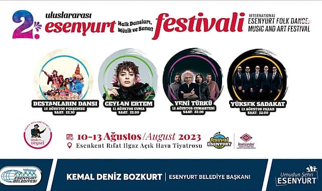 ‘2. Uluslararası Esenyurt Halk Dansları, Müzik ve Sanat Festivali’ için geri sayım başladı. 10 Ağustos'ta başlayacak festivalde; Ceylan Ertem, Yeni Türkü ve Yüksek Sadakat’in vereceği konserler ile Esenyurtlular dört gün boyunca eğlenecek. Bu yıl ikincisi düzenlenen Esenyurt Uluslararası Halk Dansları, Müzik ve Sanat Festivali başlıyor. 10-13 Ağustos 2023 tarihleri arasında düzenlenecek festivalde 40 ülkeden sahne alacak dans gruplarının yanı sıra uluslararası zanaatkarlar sokağı da kurulacak. Dört gün boyunca dünya kültürlerine ev sahipliği yapacak festival, UNESCO ve Türkiye tarafından 2023 yılının “Aşık Veysel Yılı’ olarak ilan edilmesi dolayısıyla Halk Ozanı Veysel Şatıroğlu’na adanacak. Aşık Veysel’in ünlü dizelerine atıfta bulunan ‘Dostlar Bizi Hatırlasın’ teması ile festivalde barış ve kardeşlik mesajları verilecek.Esenkent Mahallesi’ndeki Rıfat Ilgaz Açık Hava Tiyatrosu’nda yapılacak olan festival, misafir grupların Esenyurt’un ayrı noktalarında yapacağı renkli gösterilerle tüm ilçeye yayılacak. Kortej yürüyüşü, uluslararası halk dansları topluluklarının gösterileri, Ceylan Ertem, Yeni Türkü ve Yüksek Sadakat konserleri ile vatandaşlar festivalde unutulmaz anlar yaşayacak. Festival, 10 Ağustos Perşembe günü yapılacak kortejin ardından açılış seremonisi ve sahne gösterileri ile başlayacak.10 Ağustos Perşembe günü 16.00’da Esenyurt Belediye Başkanı Kemal Deniz Bozkurt’un Esenkent Akbatı AVM bahçesinde açılışını gerçekleştireceği Zanaatkârlar Sokağı, 4 gün boyunca 15.00 ile 23.00 saatleri arasında açık olacak. Zanaatkârlar Sokağı’nda; Özbekistan, Kırım, Azerbaycan, Moldova, Kırgızistan, Kazakistan, Rusya, Belarus, Finlandiya, Gürcistan, Macaristan ve Arnavutluk’tan olmak üzere 27 uluslararası el sanatı ve 32 Anadolu el sanatının sergileneceği stantlar yer alacak.