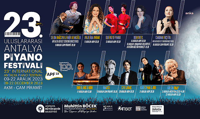 Tam 23 yıldır Antalya'nın ‘Uluslararası Sanat Şehri’ kimliğine katkıda bulunan, Avrupa Festivaller Birliği (EFA) üyesi Uluslararası Antalya Piyano Festivali, bu yıl 9-22 Aralık 2023 tarihleri arasında yapılacak. Antalya Büyükşehir Belediyesi’nin ev sahipliğindeki festival, Türkiye ve dünyadan birçok sanatçıyı müzikseverlerle buluşturmaya hazırlanıyor. Festivalde bu yıl şehir etkinlikleri kapsamında Aurelien Froissart ve Il Grande Piano, festivalin halkla kaynaşmasına katkıda bulunacak. Festival kapsamında Fahir Atakoğlu & Selda Bağcan Antalya Devlet Senfoni Orkestrası (ADSO) eşliğinde, Anjelika Akbar, Queenz of Piano, Dorantes, Candan Erçetin & ADSO, Selin Şekeranber ve Yudum Çetiner - Duo Blanc & Noir, Havasi, Can Saraç, Igudesman & Joo ve Gülsin Onay sahne alacak.MÜZİĞİN KALBİ ANTALYA’DA ATACAKAntalya’nın kültür ve sanatın da başkenti olması yolunda önemli etkinlikleri hayata geçirdiklerini ve Uluslararası Piyano Festivali’nin bu anlamda büyük bir güç olduğunu belirten Antalya Büyükşehir Belediye Başkanı Muhittin Böcek, festivallerin toplumu sanatla birleştiren en önemli etkinlikler olduğunu belirterek, “Antalya’mız kültür ve sanat şehri, Antalya’mız festivaller şehri. En önemli sosyal etkinliklerden olan festivaller, mutlaka siyaset üstü tutulmalı. Uluslararası Piyano Festivalimiz, her geçen yıl çıtayı bir öncekinden daha yükseğe çıkararak büyüyor. Bu yıl da tüm dünyanın gözü bu önemli sanat etkinliğimizde olacak. Tüm vatandaşlarımızı bu büyük sanatsal buluşmayı kaçırmamaya davet ediyorum” diye konuştu.ŞEHİR ETKİNLİKLERİ MUHTEŞEMFestival coşkusu bu yıl önce şehir etkinlikleri ile başlayacak. Şehir etkinlikleri; piyano videoları ile sosyal medyada 1 milyondan fazla takipçisi olan, klasik müziği halk için ulaşılabilir kılmak amacıyla yola çıkan ve dinleyicilerin de interaktif olarak katılabileceği Antalya’daki ilk konseriyle 2 Aralık’ta Saat Kulesi, 3 Aralık’ta da Cam Piramit’te genç neslin yetenekli piyanisti Aurelien Froissart ile başlayacak. Yere kurulan ve ayaklarla çalınan midi bir klavyeyle yaptıkları şov ile videoları milyonlarca izlenen, dünyanın her yerinde binlerce insana ulaşan Il Grande Piano’nun 9 Aralık’ta Saat Kulesi ve 10 Aralık’ta Alanya’da vereceği konserler ile şehir etkinleri halkla buluşacak. ATAKOĞLU ve BAĞCAN İLE AÇILIŞ KONSERİ9-22 Aralık 2023 tarihleri arasında yıldızlar geçidine sahne olacak festivalde; açılış konseri klasik müzik icracısı ve bestecisi olarak dünya çapında tanınan besteci ve piyanist Fahir Atakoğlu, The Times’ın ‘Dünya Müziğinde Yaşayan Efsane ve Tarihi Kadın Şarkıcılar Listesi’ne ‘Efsane Anadolu Şarkıcısı’ olarak adını yazdıran Selda Bağcan solistliğinde Antalya Devlet Senfoni Orkestrası eşliğinde 9 Aralık’ta Cam Piramit’te dinleyici ile buluşacak. Besteci, piyanist ve yazar Anjelika Akbar'ın, geçen haftalarda, tüm dijital platformlarda yerini alan albümü ‘AHENK 432’nin gala konseri de 23.Uluslararası Antalya Piyano Festivali kapsamında 11 Aralık’ta AKM’de gerçekleşecek. İki kuyruklu piyano eşliğinde klasik ve pop müzik arasındaki sınırlarda dolaştıkları performanslarıyla klasik bir konserde de çok fazla eğlenebilmenin mümkün olduğunu gösteren Queenz of Piano 13 Aralık’ta AKM’de, Flamenko’da oldukça sıra dışı bir enstrüman olarak kabul edilen piyano ile müzikal füzyon dünyasının kapılarını aralayan Dorantes, ‘Sur Sinfonico’ projesiyle 15 Aralık AKM ve 16 Aralık Manavgat Belediyesi Atatürk Kültür Merkezi’nde Antalya’daki dinleyicilerle buluşacak. CANDAN ERÇETİN’DEN ATATÜRK’ÜN SEVDİĞİ ŞARKILARTürk müziğinin güçlü sesi Candan Erçetin de festival kapsamında Antalya Devlet Senfoni Orkestrası eşliğinde Atatürk’ün Sevdiği Şarkılar Konseri ile 16 Aralık’ta Cam Piramit’te müzikseverlerle buluşacak. Selin Şekeranber ve Yudum Çetiner’den Duo Blanc & Noir, ‘Imagine’ konseri ile 17 Aralık’ta AKM’de, piyano virtüözü olmakla birlikte sadece bir piyanist değil aynı zamanda izleyicinin kalbine dokunan ve kulakları mest eden müziklerin de bestecisi Havasi, 19 Aralık’ta Cam Piramit’te sergileyecekleri performanslarla festivale renk katacak. İtalya'da düzenlenen Piano Academy Eppan yarışmasında Michelangeli Ödülü'nün sahibi olan 16 yaşındaki genç yetenek Can Saraç 20 Aralık, müzikal anlamdaki başarıları ile internette ve uluslararası alanda birer yıldıza dönüşen Igudesman & Joo 21 Aralık’ta AKM’de dinleyici ile buluşacak.KAPANIŞ KONSERİ GÜLSİN ONAY’DANFestivalin kapanışında Gülsin Onay, Erkin Onay’ın da konuk olacağı konser ile 22 Aralık’ta AKM sahnesinde dinleyici ile buluşacak. Gülsin Onay 21 Aralık’ta ise Aksu Fen Lisesi’nde kısa bir resital verip bir de söyleşi yapacak.