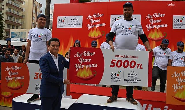Kumluca’da 24. Geleneksel Kumluca Tarım ve Seracılık Festivali etkinlikleri kapsamında düzenlenen acı biber yeme yarışmasına 2’si kadın 15 yarışmacı katıldı. Yarışmada, 3 dakikada 260 gram biber yiyen Yetkin Tuncer, birinci oldu.Kumluca ilçesinde 24. Geleneksel Kumluca Tarım ve Seracılık Festivali kapsamında düzenlenen Acı Biber Yeme Yarışması renkli görüntülere sahne oldu.Cumhuriyet Meydanı'nda gerçekleştirilen yarışmada jüri üyeleri tarafından hassas terazilerde tartılan acı biberler yarışmacılara teslim edildi.Yarışmaya 2'si kadın 15 yarışmacı katılırken, yarışmacılara biberlerin acısını gidermesi için Kumluca’da yetiştirilen domates ve ayran ikram edildi. İki grupta gerçekleştirilen ve üç dakika süre verilen yarışmada, yarışmacılar en fazla acı biberi yiyebilmek için mücadele etti. Yarışma sonunda üç dakikada 260 gram biber yiyen Yetkin Tuncer birinci, 242 gram biber yiyen Semih Akın ikinci ve 228 gram biber yiyen Hüseyin Yılmaz ise üçüncü oldu. Yarışma sonunda Kumluca Belediye Başkanı Mustafa Köleoğlu tarafından katılan her yarışmacıya 500 TL para ödülü verildi. Birinciye 5000 TL, ikinciye 3000 TL, üçüncüye 2000 TL ödül verilirken, yarışmaya katılan iki kadın yarışmacıya da kolye hediye edildi.Başkan Mustafa Köleoğlu, "24. Geleneksel Kumluca Tarım ve Seracılık Festivali etkinliklerimizle Türkiye’mize ve dünyamıza sağlıklı gıdamızı, Kumluca’mızı anlatıyoruz. Dünyanın 172 ülkesine ihracatını gerçekleştirdiğimiz acı biberlerimiz önemlilerinden bir tanesi. Dünyaya tanıtlamasında katkı sağlayan yarışmacılarımıza ve ekibimize teşekkür ediyorum" dedi.