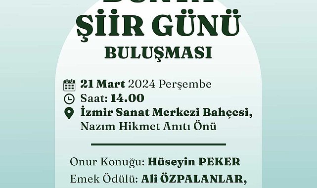 İzmir Büyükşehir Belediyesi, bu yıl "Dünya Şiir Günü Buluşması"nın üçüncüsünü düzenleyecek. 21 Mart’ta Kültürpark İzmir Sanat Merkezi Bahçesi Nazım Hikmet Anıtı önündeki buluşmada şair Hüseyin Peker onur konuğu olacak.İzmir Büyükşehir Belediyesi Kent Arşivi, Müzeler ve Kütüphaneler Şube Müdürlüğü, etkinliklerine “3. İzmir Dünya Şiir Günü Buluşması” ile devam ediyor. 21 Mart Perşembe günü 14.00 ile 17.00 saatleri arasında Kültürpark’ta, İzmir Sanat Merkezi Bahçesi Nazım Hikmet Anıtı önünde yapılacak Şiir Günü Buluşması’nda “Dünya Şiir Günü Bildirisi” onur konuğu Hüseyin Peker tarafından okunacak. Şair Ali Özpalanlar, Oğuz Tümbaş ve Asım Öztürk’e ise teşekkür niteliğinde “Emek Ödülü” takdim edilecek.KENT ŞAİRLERİ BİLDİRİ OKUYOR2022’den beri İzmir Büyükşehir Belediyesi ve Uluslararası Aktivist Sanatçılar Birliği iş birliğiyle Homeros’un kenti olma kimliğiyle “Dünya Şiir Günü” kent şairleri tarafından kaleme alınan bildirinin okunmasıyla kutlanıyor. Ayrıca etkinlikte kentin şairlerine “Emek Ödülü” takdim ediliyor. 2022 yılında Yaşar Aksoy, Okan Yüksel, Hüseyin Yurttaş ve Mehmet Sadık Kırımlı’ya; 2023 yılında Necati Yıldırım, Süreyya Berfe, Mehmet Yaşar Bilen, Mehmet Mümtaz Tuzcu’ya ödülleri sunulmuştu.