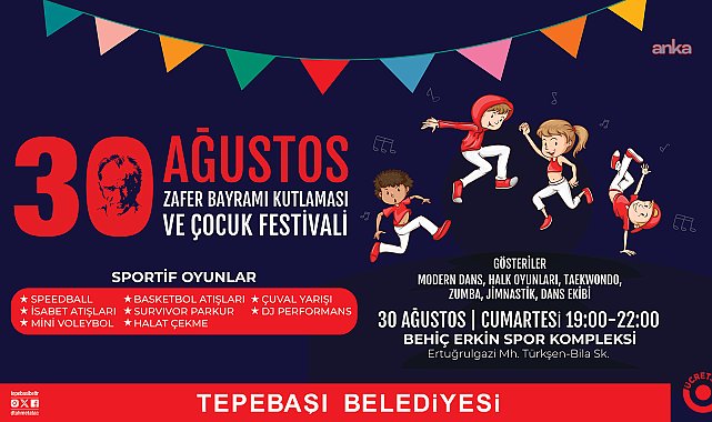 (ESKİŞEHİR) - Tepebaşı'nda 30 Ağustos coşkusu, "Zafer Bayramı Kutlaması ve Çocuk Festivali" ile taçlanacak. Tepebaşı'nda bayram coşkusu, 30 Ağustos Zafer Bayramı Kutlaması ve Çocuk Festivali ile ilçeye yayılacak. Etkinlikte speedball, isabet atışları, mini voleybol, basketbol atışları, survivor parkur, halat çekme, çuval yarışı gibi oyunlar yer alacak.Yaz dönemi kurslarının da kapanışının yapılacağı programda modern dans, halk oyunları, tekvando, zumba, cimnastik ve dans ekibinin gösterileri yer alacak. Behiç Erkin Spor Kompleksi'nde düzenlenecek etkinlik, 30 Ağustos Cumartesi günü 19.00-22.00 saatleri arasında gerçekleşecek.