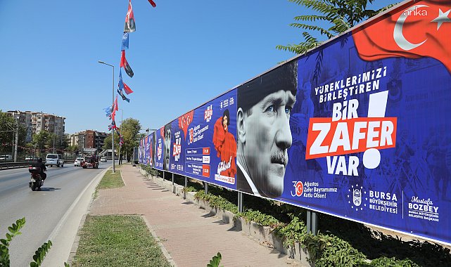 (BURSA) – Bursa Büyükşehir Belediyesi, 30 Ağustos Zafer Bayramı öncesinde kentin dört bir yanını ‘Bir Zafer Var’ temalı afiş ve billboardlarla donatarak, 7’den 70’e herkese Büyük Zafer’in coşkusunu yaşatıyor.Bursa Büyükşehir Belediyesi, 30 Ağustos Zafer Bayramı'nı çeşitli programlarla kutluyor. Bu kapsamda bağımsızlığın simgesi, Cumhuriyet'in kuruluşuna giden yolun mihenk taşı olan 30 Ağustos Zafer Bayramı için kentin dört bir yanı, ‘Yüreklerimizi Birleştiren, Yolumuzu Aydınlatan, Yarınlara İlham Olan, Her Nesilde Yaşayan, Bir Zafer Var’ temalı billboardlarla süslendi.Kentin ana arterlerinden meydanlarına, köprü üstlerinden duraklara kadar pek çok noktada yer alan zafer temalı görseller, milli birlik duygusunu pekiştirirken, Bursalılara şimdiden Zafer Bayramı coşkusunu yaşatıyor.