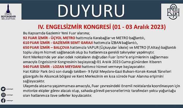 Engelsiz yaşamın öncüsü olabilmek için yola çıkan İzmir Büyükşehir Belediyesi, 1-3 Aralık’ta dördüncüsünü düzenleyeceği Uluslararası Engelsizmir 2023 Kongresi’ne katılmak isteyen vatandaşlar için ulaşım noktaları oluşturdu. Karşıyaka Vapur İskelesi, Fahrettin Altay Metro Durağı, Konak Diş Hastanesi önü, ESBAŞ İZBAN İstasyonu’ndan kaldırılacak servisler ile engelsiz ulaşım araçları Gaziemir Fuar İzmir’e ring seferleri düzenleyecek.Engelsiz yaşam yolunda sayısız proje yürüten İzmir Büyükşehir Belediyesi, 1-3 Aralık tarihlerinde ev sahipliği yapacağı 4. Engelsizmir Kongresi için ulaşım noktaları oluşturdu. Karşıyaka İskele, Fahrettin Altay Metro Durağı, Konak Diş Hastanesi Önü, ESBAŞ İZBAN İstasyonu önünden kaldırılacak servisler ile engelsiz ulaşım araçları Gaziemir Fuar İzmir’e ring seferleri düzenleyecek. Araçların kalkış saatleri 09.00, 10.00, 13.30, dönüş saatleri ise 14.30 ile 17.30 olarak belirlendi.4. Uluslararası Engelsizmir Kongresi için Gaziemir Fuar İzmir alanına giden otobüs hatları ise şöyle: 92 (Gaziemir Fuar İzmir-Üçyol Metro), 540 (Gaziemir Fuar İzmir-Lozan Meydanı), 610 (Gaziemir Fuar İzmir -Gaziemir Semt Garajı), 650 (Gaziemir Fuar İzmir -Balçova).PANEL, KONFERANS, ATÖLYE ÇALIŞMALARI, ÖZEL OTURUMLAR Engellilere ilişkin farkındalık yaratmak ve yaşadıkları sorunlara çözüm üretmek amacıyla bu sene dördüncü kez yapılacak uluslararası kongre “Engellilik Alanında Yenilikçi Yaklaşımlar” temasıyla düzenlenecek. Engelli hemşehrilerin yaşamlarını iyileştirmek, topluma katılımlarını artırmak ve engelleri kaldırmak için çeşitli alanlarda çalışan uzmanlar, araştırmacılar ve paydaşlar Gaziemir Fuar İzmir D Holü’nde bir araya gelecek. Onursal başkanlığını İzmir Büyükşehir Belediye Başkanı Tunç Soyer, başkanlığını ise Doç. Dr. Levent Köstem’in yaptığı Engelsizmir 2023 Kongresi’nde destekli istihdam modeli, engelli istihdamında uygulama örnekleri, sürdürülebilir ve yaşanabilir gelecek için sosyal girişim ve işletme modelleri, tele sağlık uygulamaları, disleksi, dil ve konuşma bozuklukları, otizmde yenilikçi yaklaşımlar konuları işlenecek. Deprem ilişkili ampütasyonlarda rehabilitasyon ve protez uygulamalarına yönelik olarak “Ampütasyon Protez Dünü ve Yarını” başlıklı özel oturum da düzenlenecek.KARİKATÜR YARIŞMASININ ÖDÜL TÖRENİ DE YAPILACAK Kongrede bilimsel oturumlarla beraber “İzdüşümü: Kukla ve İnsan” fotoğraf sergisi, “Dokunabilir Modern Sanat Seramik Eserler” sergisi, “Yeşilova Höyüğü: İzmir’in 8500 Yıllık Tarihine Dokunmak” sergileri de düzenlenecek. 1 Aralık’ta İzmir Büyükşehir Belediyesi tarafından yapılan ulusal karikatür yarışmasının ödül töreni ve sergi açılışı da var. Konusu “İş Hayatında Engelliler” olarak belirlenen yarışmanın sonuçları ise yarın duyurulacak.Sosyal hayatı geliştirmek amacıyla hazırlanan programlarda hareket atölyeleri, tasarım atölyeleri, sosyal beceri atölyeleri yer alıyor. Aynı zamanda İzmir Büyükşehir Belediyesi ve sivil toplum örgütlerinin sunumları ve gösteriler olacak. Christy Lynch, Prof. Jeremie Gaveau, Dr. Patrick Quercia gibi uluslararası alandan isimlerin de olacağı kongreye katılım ücretsiz. Ayrıntılı bilgi için www.engelsizmir.com adresi ziyaret edilebilir.