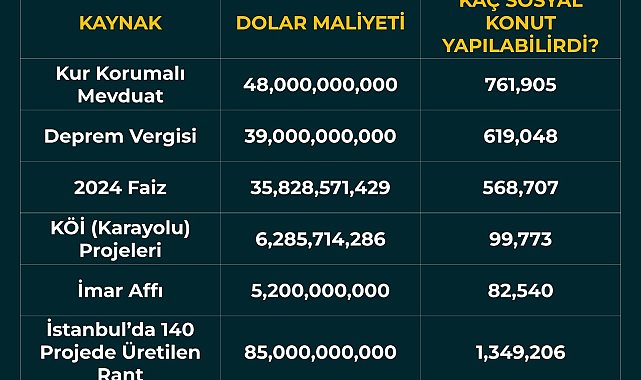 Kur Korumalı Mevduat garabetiyle 48 milyar dolar milletten alındı, bir avuç zümreye verildi. Bu parayla 761 bin 904 konut üretilebilirdi. Deprem Vergilerimiz Bakanın açıkladığı gibi duble yollara gitmeseydi 24 yılda toplanan 39 milyar dolar ile 619 bin 47 sosyal konut üretilirdi. 2024 Merkezi bütçenin faizi giderleri için harcanan para 1 trilyon 254 milyar TL oldu. Ülke kötü yönetilip faiz bu maliyeti bu kadar yükseltilmese, bu parayla 568 bin 707 sosyal konut yapılabilirdi. 2019 – 2022 arasında Karayolları Genel Müdürlüğü'nün Kamu Özel İş birliği Projeleri Bütçesi 220 milyar TL oldu. Geçiş garantili yollara yani geçmediğimiz yol köprü tünellere Hazine tarafından ödenen parayla 99 bin 773 konut üretilebilirdi. İmar Barışı adı verilen İmar Affı ile toplanan 5,2 milyar Dolar Kanun’un gerekçesinde belirtildiği üzere deprem risklerini azaltmak için kullanılsaydı 82 bin 539 konut yapılabilirdi. İstanbulda 25 yıl boyunca 140 alanda rant operasyonları yapılmasaydı, üretilen 85 milyar dolar rantla halkımıza 1 milyon 349 bin 206 konut sunulabilirdi. Toplamda harcanan bu büyük kaynaklarla 3 milyon 481 bin 179 konut üretilir, tüm Türkiye'de tüm konutlar afet güvenliğine kavuşur kimse tabutunda yaşamak zorunda kalmazdı.