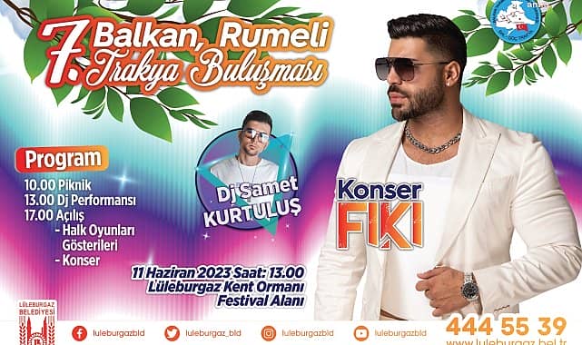 Lüleburgaz Belediyesi’nin bu yıl 7’ncisi düzenleyeceği ‘Balkan Rumeli Trakya Buluşması’, 11 Haziran’da Lüleburgaz Kent Ormanı’nda yapılacak. Balkanların sevilen sesi Fiki’nin konser vereceği buluşmada, ünlü DJ Samet Kurtuluş da gün boyu DJ performansı sergileyecek. Lüleburgaz Belediyesi’nin Balkan coğrafyasını bir araya getireceği ‘7. Balkan Rumeli Trakya Buluşması’, 11 Haziran Pazar günü saat 13:00’te Kent Ormanı’nda düzenlenecek.BAL-GÖÇ Trakya Derneği iş birliğiyle düzenlenecek etkinlik, saat 10:00’da piknikle başlayacak ve saat 13:00’te ünlü DJ Samet Kurtuluş’un performansıyla devam edecek. Saat 17:00’de resmen başlayacak Balkan Rumeli Trakya Buluşması’nda, halk oyunları gösterileri katılımcılarla buluşacak. Festival, Fiki konseriyle sona erecek.