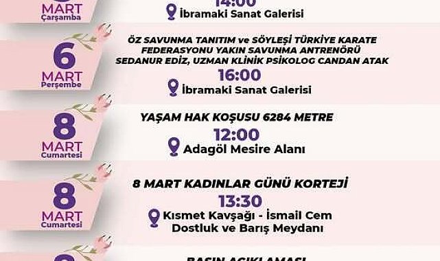 (AYDIN) - 8 Mart Dünya Emekçi Kadınlar Günü, Kuşadası’nda düzenlenecek çeşitli etkinliklerle kutlanacak. Kadınlar, İsmail Cem Dostluk ve Barış Meydanı’nda yapacakları basın açıklaması ile yaşadıkları soranlara ve kadın haklarına dikkat çekecek. Kuşadası’nda düzenlenecek 8 Mart Dünya Emekçi Kadınlar Günü etkinlikleri, cumartesi saat 12.00’de Ada Göl Mesire Alanı’nda "6284 Metre Yaşam Hak Koşusu" ile başlayacak.Koşu sonrasında, kadın yürüyüşü düzenlenecek, saat 13.30’da Kısmet Kavşağı’ndan yürümeye başlayacak kadınlar, İsmail Cem Dostluk ve Barış Meydanı’nda yapacakları basın açıklaması ile kadınların yaşadığı sorunlara ve kadın haklarına dikkat çekecek.Etkinlikler, saat 16.00’da İbramaki Sanat Galerisi’nde, Kuşadası Kültür ve Sanat Derneği tarafından Kuşadalı aktivist ve gazeteci Selver Savran’ı anmak amacıyla hazırlanan müzik ve şiir dinletisi ile son bulacak.Ayrıca Kuşadası Belediyesi Kadın Danışma Merkezi tarafından İsmail Cem Dostluk ve Barış Meydanı’nda açılacak stantlardan, çeşitli bilgilendirici broşürler ile hediyeler dağıtılacak.