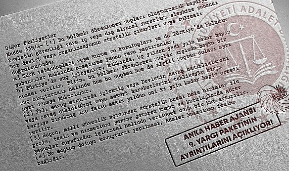HABER: ESRA TOKAT(ANKARA) - 9. Yargı Paketi taslağına göre 5237 Sayılı Türk Ceza Kanunu’nun 339’uncu maddesinden sonra gelmek üzere ve kamuoyunda ''etki ajanlığı'' olarak bilinen düzenleme "diğer faaliyetler" başlığıyla yer aldı. Buna göre, devletin güvenliği veya iç veya dış siyasal yararları aleyhine yabancı bir devlet veya organizasyonun stratejik çıkarları veya talimatı doğrultusunda Türk vatandaşları veya kurum ve kuruluşları ya da Türkiye’de bulunan yabancılar hakkında araştırma yapan veya yaptıranlar hapis cezası ile cezalandırılacak.Taslak, 38 maddeden oluşuyor. 5237 Sayılı Türk Ceza Kanunu’nun 339’uncu maddesinden sonra gelmek üzere eklenmesi önerilen taslakta yer alan 22’nci madde kamuyounda ''etki ajanlığı'' olarak tartışılıyor. Bazı hukukçularda bu düzenlemeye ''yeni tip casusluk'' suçu diye nitelendiyor. Buna göre, devletin güvenliği veya iç veya dış siyasal yararları aleyhine yabancı bir devlet veya organizasyonun stratejik çıkarları veya talimatı doğrultusunda Türk vatandaşları veya kurum ve kuruluşları ya da Türkiye’de bulunan yabancılar hakkında araştırma yapan veya yaptıranlar hapis cezası ile cezalandırılacak."DEVLETİN İÇ VEYA DIŞ SİYASAL YARARLARI" KAVRAMISöz konusu "etki ajanlığı" olarak tartışılan madde düzenlemesinin gerekçesinde, "Devletin iç veya dış siyasal yararına yönelik olarak gerçekleştirilen bazı faaliyetlerin cezalandırılması kabul edilmektedir. Bu kapsamda iktisadi, mali, askeri, milli savunma, kamu sağlığı, kamu güvenliği, kamu düzeni, teknolojik, kültürel, ulaştırma, haberleşme, siber alan, kritik altyapılar ve enerji gibi diğer yararlar da devletin iç veya dış siyasal yararları kavramı içinde kabul edilecektir. Dolayısıyla bu gibi yararlar aleyhine gerçekleştirilen faaliyetler de suçun konusunu oluşturabilecektir." ifadesi ise dikkati çekiyor.Söz konusu düzenleme şöyle: Diğer faaliyetler