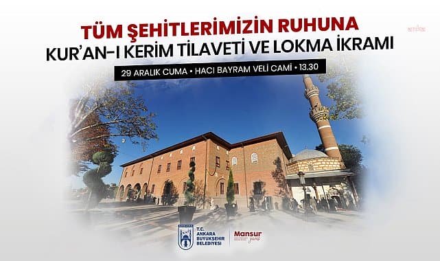 Ankara Büyükşehir Belediyesi, şehitler için 29 Aralık Cuma günü saat 13.30’da Hacı Bayram Veli Camisi’nde Kuran-ı Kerim okutarak, lokma dağıtımı gerçekleştirecek.