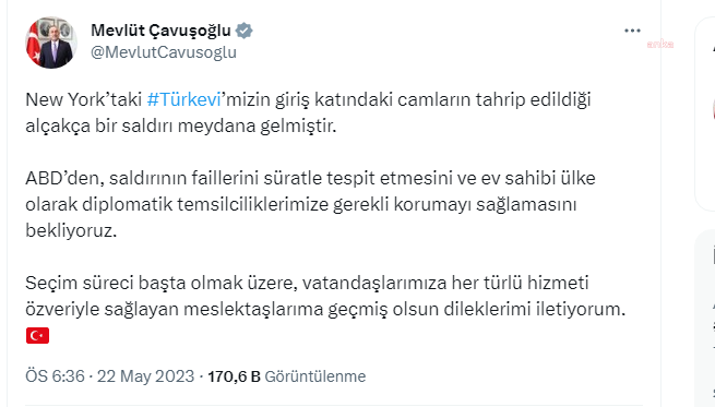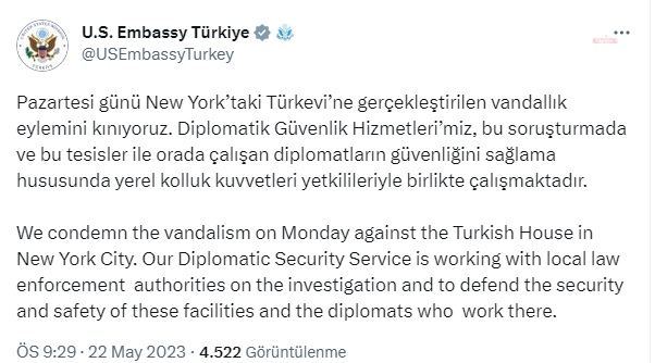 ABD’nin Ankara Büyükelçiliği, Türkiye'nin Birleşmiş Milletler Daimi Temsilciliği ile New York Başkonsolosluğu'na ev sahipliği yapan Türkevi binasının saldırıya uğramasına ilişkin; “New York’taki Türkevi’ne gerçekleştirilen vandallık eylemini kınıyoruz. Diplomatik Güvenlik Hizmetlerimiz, bu soruşturmada ve bu tesisler ile orada çalışan diplomatların güvenliğini sağlama hususunda yerel kolluk kuvvetleri yetkilileriyle birlikte çalışmaktadır” açıklamasını yaptı.ABD’nin Ankara Büyükelçiliği, Türkiye'nin Birleşmiş Milletler Daimi Temsilciliği ile New York Başkonsolosluğu'na ev sahipliği yapan ve Cumhurbaşkanlığı seçiminin ikinci turunda oy kullanılan Türkevi binasına yapılan saldırıyla ilgili açıklama yaptı. ABD’nin Ankara Büyükelçiliği Twitter hesabından söz konusu saldırıya ilişkin şu paylaşımı yaptı:“Pazartesi günü New York’taki Türkevi’ne gerçekleştirilen vandallık eylemini kınıyoruz. Diplomatik Güvenlik Hizmetleri’miz, bu soruşturmada ve bu tesisler ile orada çalışan diplomatların güvenliğini sağlama hususunda yerel kolluk kuvvetleri yetkilileriyle birlikte çalışmaktadır."DİPLOMATİK TEMSİLCİLİKLERİMİZE GEREKLİ KORUMAYI SAĞLAMASINI BEKLİYORUZDışişleri Bakanı Mevlüt Çavuşoğlu ise söz konusu saldırıya ilişkin Twitter hesabından şu mesajı yayınlamıştı:“New York’taki Türkevi’mizin giriş katındaki camların tahrip edildiği alçakça bir saldırı meydana gelmiştir. ABD’den, saldırının faillerini süratle tespit etmesini ve ev sahibi ülke olarak diplomatik temsilciliklerimize gerekli korumayı sağlamasını bekliyoruz. Seçim süreci başta olmak üzere, vatandaşlarımıza her türlü hizmeti özveriyle sağlayan meslektaşlarıma geçmiş olsun dileklerimi iletiyorum.”
