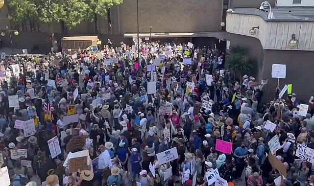 (ANKARA) - ABD Başkanı Donald Trump ve Hükümet Verimliliği Departmanı'nın (DOGE) başındaki Elon Musk'a karşı dün ülkenin 50 eyaletinde milyonlarca insanın katıldığı çok sayıda protesto gösterisi ve eylem düzenlendi. Protestolara katılanlar, Trump ve Musk’a yönelik, demokrasi, insan hakları ve özgürlüklerinden "Ellerini Çek" diyerek tepki gösterdi.ABD Başkanı Donald Trump ve Hükümet Verimliliği Departmanı'nın (DOGE) başındaki Elon Musk'a karşı, insan hakları ve özgürlükleri ile demokrasi savunucuları tarafından ülkenin 50 eyaletinde çok sayıda protesto ve eylem düzenlendi.Sivil haklar örgütleri, gaziler, kadın hakları grupları, işçi sendikaları ve LGBTQ+ savunucularını içeren 150’den fazla grup bir araya gelerek koalisyon oluşturdu. New York Manhattan'dan Alaska'ya kadar ülkenin dört bir yanındaki şehirlerde, milyonlarca protestocu, Trump ve Musk'ın hükümetin küçültülmesi, ekonomi, göç ve insan hakları konusundaki politikalarına karşı ses çıkardı.Milyonlar Trump yönetimine karşı sokaklara döküldüTrump yönetimi politikalarını, "demokrasi karşıtı ve özgürlüklere yönelik düşmanca bir ele geçirme" olarak niteleyen milyonlarca ABD vatandaşı, Trump ve Musk’a karşı sokaklara döküldü.Protestocular, ayrıca yönetimin binlerce federal çalışanı işten çıkarma, Sosyal Güvenlik İdaresi saha ofislerini kapatma, tüm kurumları fiilen kapatma, göçmenleri sınır dışı etme, trans bireylere yönelik korumaları azaltma ve sağlık programlarına yönelik fonları kesme hamlelerine karşı öfkelerini dile getirdi.Vatandaşlar, ülke genelinde, eyalet başkentlerinde, federal binalarda, kongre ofislerinde, Sosyal Güvenlik merkezlerinde, parklarda ve belediye binalarında, alışveriş merkezlerinde bir araya gelerek, çok sayıda yürüyüş ve miting düzenledi.Batı Yakası'ndaki protestocular, "Oligarşiyle savaş" gibi sloganlar içeren pankartlar taşıdı. Portland ve Oregon’da sokaklara dökülen protestocular Pershing Meydanı'ndan Belediye Binası'na kadar sloganlar atarak yürüdü.Boston'da protestocular, “Demokrasimizden elinizi çekin” ve “Sosyal Güvenliğimizden elinizi çekin” gibi pankartlar taşıdı. Los Angeles'ta protestocular, “Halka Güç” sloganları atarak ve “Eğitimden Elini Çek” ve “Diren, Diren” gibi mesajlar içeren pankartlar taşıyarak, Belediye Binasına doğru 1.6 km boyunca yürüdü.Washington D.C'de "Pikachu" kostümlü eylemciİstanbul Büyükşehir Belediye Başkanı Ekrem İmamoğlu'nun 23 Mart Pazar günü tutuklanmasının ardından Türkiye'de genelindeki eylemler de dünyada dikkatle izlenmiş, Antalya’nın Muratpaşa ilçesindeki gösterilerde, Pikachu kıyafeti giyen bir eylemcinin sosyal medyada yer alan görüntüsü kısa zamanda dünyanın da gündemine oturmuştu. Washington D.C'deki eylemlerde Pikaçu kostümü giyen protestocular da dikkat çekti.Protestocular, Trump'ın golf oynadığı sahanın çevresinde gösteri düzenlediBeyaz Saray'dan yapılan açıklamada, Trump’ın dün Florida'da golf oynadığı ve bugünü de aynı şekilde geçirmeyi planladığı belirtilmişti. Buna göre, Trump’ın dün sabah Florida'nın Palm Beach Gardens kentindeki golf kulübünde olduğunu bilen protestocular, golf sahasının birkaç kilometre ötesinde arabalarıyla dizildi. Protestocular, korna çalarak, Trump karşıtı sloganlar attı. Pankartlarda ve dövizlerde, "İster demokrasimize yönelik saldırılar, ister istihdamın azaltılması, ister özel hayatın gizliliğinin ihlali, isterse de hizmetlerimize yönelik saldırılar nedeniyle harekete geçmiş olun, bu an sizin için", "Bu krize karşı kitlesel, görünür, ulusal bir ret oluşturmak için yola çıkıyoruz”, “1938 Nazi Almanya'sında gibi direnin” ve “Faşizm yaşıyor ve Beyaz Saray'da yaşıyor” ifadeleri yer aldı.Harekete öncülük eden kuruluşlardan biri olan Indivisible'a göre, protestolar ABD dışına da yayıldı ve Londra ile Paris gibi büyük şehirlerde gerçekleşen protestolara katılmak için yaklaşık 600 bin kişi kaydoldu.Demokrat Parti Temsilcisi Raskin: "Hiçbir ahlaklı insan, ekonomiyi çökerten bir diktatör istemez”Protestolar sırasında aralarında Maryland eyaletinin Demokrat Parti Temsilcisi Jamie Raskin'in de bulunduğu çok sayıda temsilci de Trump yönetimi hakkında konuşmak üzere kürsüye çıktı. Raskin, “Mussolini'nin siyasetine ve Herbert Hoover'ın ekonomisine” sahip bir başkanla gelecek olmadığını söyledi. Raskin, “Kurucularımız ‘Biz diktatörler’ diye başlamayan bir Anayasa yazdılar, giriş bölümünde ‘Biz halkız’ yazıyor. Hiçbir ahlaklı insan, her şeye fiyat biçen ve hiçbir şeyin değerini bilmeyen, ekonomiyi çökerten bir diktatör istemez” dedi.Florida Temsilcisi Maxwell Frost da bir konuşma yaparak insanları, "protesto ederek, karşılıklı yardımlaşmaya bağışta bulunarak, yön eylemlerine katılarak ve yasama stratejilerine odaklanarak harekete geçmeye" çağırdı. Frost, "İnsanlık tarihi boyunca otoriterler, sahip oldukları güçle asla tatmin olmazlar ve bu yüzden sınırları test ederler, sınırları zorlarlar, yasaları çiğnerler ve sonra sessiz mi yoksa gürültülü mü olduklarını görmek için halka bakarlar" dedi. İnsan Hakları Kampanyası Başkanı Robinson: "Biz bu Amerika'yı istemiyoruz, hak ettiğimiz Amerika'yı istiyoruz"İnsan Hakları Kampanyası savunuculuk grubunun başkanı Kelley Robinson, Washington, D.C.'deki National Mall'da düzenlenen ve Demokrat Kongre üyelerinin de sahne aldığı mitingde, yönetimin LBGTQ+ topluluğuna yönelik tutumunu eleştirdi. Robinson, şunları söyledi:"Gördüğümüz saldırılar sadece siyasi değil. Bunlar kişiseldir. Kitaplarımızı yasaklamaya çalışıyorlar, HIV önleme fonlarını kesiyorlar, doktorlarımızı, öğretmenlerimizi, ailelerimizi ve 