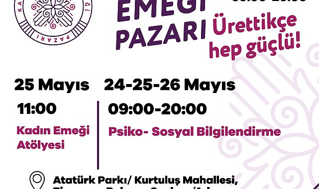 (ADANA)- Adana Büyükşehir Belediyesi Kadın ve Aile Hizmetleri Dairesi tarafından, üreten kadınların emeklerinin sergilendiği Kadın Emeği Pazarı’nın altıncısı düzenleniyor.Adana Büyükşehir Belediyesi Kadın ve Aile Hizmetleri Daire Başkanlığı tarafından organize edilen kadın kooperatifleri, girişimcilerin el emeği hediyelik ürünlerini sergileneceği Kadın Emeği Pazarı 24-26 Mayıs'ta altıncı kez açılıyor.“Ürettikçe Hep Güçlü” sloganıyla kurulan Kadın Emeği Pazarı, Adana’da faaliyet gösteren kadın kooperatifleri ve üreticilerin katılımıyla başlayacak.Büyükşehir Belediyesi Kadın ve Aile Hizmetleri Dairesi Başkanlığı, girişimci kadınların ürünlerinin satılabilmesi için çeşitli etkinlikler düzenliyor.Pazarda, takı, örgü, tığ, dikiş, süsleme, boyama, çanta yapımı, örgü bebek, kanaviçe, seramik, çini, mum, doğal taş süsleme, cam, resim gibi ürünler satışa sunulacak.Pazar kapsamında gerçekleştirilecek atölye çalışmalarında ayrıca, Kadın ve Aile Hizmetleri Dairesi Başkanlığının faaliyetleri, hizmetleri ve birimleri anlatılacak. Kadın hakları, birlikte yaşama, çevre bilinci konusunda farkındalık sağlayıcı bilgilendirme yapılarak, kadına yönelik şiddetle mücadele kapsamında Adana Büyükşehir Belediyesi’nin yürüttüğü çalışmalar hakkında vatandaşlara bilgi verilecek.