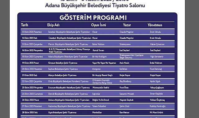 (ADANA) - Adana Büyükşehir Belediyesi Şehir Tiyatroları'nın düzenlediği 10. Şehir Tiyatroları Festivali, 13 Ekim 2025 Pazartesi günü İstanbul Büyükşehir Belediyesi Şehir Tiyatroları’nın sahneleyeceği Claude Magnier’in yazdığı Ersin Umulu’nun yönettiği komedi türündeki ‘Oscar’ isimli oyun ile başlıyor. 5 Kasım 2025 Çarşamba günü Kocaeli Büyükşehir Belediyesi Şehir Tiyatroları’nın sahneleyeceği ‘Üç Jokerli Konken’ ile son bulacak festival kapsamında 19 şehir tiyatrosu ekibi 22 oyun sahneleyecek. Adana Büyükşehir Belediyesi Tiyatro Şube Müdürü Melih Rahmi Akyol, 24 gün sürecek festivalde Adanalıların tiyatroya doyacağını belirterek, tüm hemşerilerini koltukları doldurmaya davet etti. Çalışmalarının artarak devam edeceğini belirten Akyol, festival kapsamındaki oyunların ise tüm Adanalılara ücretsiz sahneleneceğini söyledi. Akyol, Adana Büyükşehir Belediyesi Kültür ve Sosyal İşler Daire Başkanı Sayın Mahmut Gögebakan’a ve sanata verdiği değerlerden dolayı Adana Büyükşehir Belediye Başkanı Zeydan Karalar’ateşekkür etti.Adana Büyükşehir Belediyesi Şehir Tiyatroları Genel Sanat Yönetmeni Önder Özcan ise şimdiden tüm ekiplere ‘hoşgeldiniz’ derken, Adana'nın böyle bir festivale sahip çıkmasının önemine vurgu yaparak, Adana Büyükşehir Belediyesi Kültür ve Sosyal İşler Daire Başkanı Mahmut Gögebakan’a ve Adana Büyükşehir Belediye Başkanı Karalar’a teşekkürlerini iletti.24 gün sürecek görsel şölende İstanbul Büyükşehir Belediyesi Şehir Tiyatroları Claude Magnier’in yazdığı, Ersin Umulu’nun yönettiği ‘Oscar’ isimli oyunu; Mersin Büyükşehir Belediyesi Şehir Tiyatrosu W. Shakespeare’nin yazdığı, Hakan Çimenser’in Yönettiği ‘Bahar Noktası’ isimli oyunu; K.K.T.C Beyarmudu Belediyesi Güney Mesarya Halk Tiyatrosu İzel Seylani’nin yazıp yönettiği ‘Kartal Yuvası ‘ isimli oyunu; Adana Büyükşehir Belediyesi Şehir Tiyatroları W. Shakespeare'nin oyunlarından Başar Sabuncu tarafından uyarlanan ve Yiğit Sertdemir tarafından yönetilen ‘Bir Ata Krallığım’ isimli oyunu; Giresun Belediye Şehir Tiyatrosu Aziz Nesin’in yazdığı Erdal Yıldırım’ın yönettiği ‘Yaşar Ne Yaşar Ne Yaşamaz’ isimli oyunu; Seyhan Belediyesi Şehir Tiyatrosu Antik oyun yazarı Sofoklesin yazıp Fırat Demirağ’ın yönettiği ‘Antigone’ isimli oyunu; Alanya Belediye Şehir Tiyatrosu Nejat Koper’in yazıp yönettiği ‘Bir Acayip Resmigeçit’ isimli oyunu; Ordu Büyükşehir Belediyesi Karadeniz Tiyatrosu Ray Bradbury’in yazıp Aydın Sigalı’nın yönettiği ‘O Güzelim Kaymaklı Dondurma Rengi Elbise’ isimli oyunu; Erzurum Büyükşehir Belediyesi Şehir Tiyatrosu Fırat Üste’nin yazıp Yakup Çağlayan’ın yönettiği ‘Matmazelin Kedisi’ isimli oyunu; Denizli Büyükşehir Belediyesi Şehir Tiyatrosu Slavomir Mrozek yazıp Sinan Küçüköz’ün yönettiği ‘Sığıntılar’ isimli oyununu; Ankara Büyükşehir Belediyesi Şehir Tiyatroları Haşmet Zeybek’in yazdığı Volkan Özgömeç’in yönettiği ‘Düğün Ya Da Davul’ isimli oyunu; Gaziantep Büyükşehir Belediyesi Şehir Tiyatrosu Şahin Ünal’ın yazdığı Kubilay Karslıpğlu’nun yönettiği ‘Totem Felsefesi’ isimli oyunu; Uşak Belediyesi Şehir Tiyatrosu Ilan Hatsor’un kaleme aldığı M. Mert Ertürk’ün yönettiği ‘Maskeliler’ isimli oyunu; Kırşehir Belediyesi Şehir Tiyatrosu Ray Cooney’in yazıp Yavuz Tekin’in yönettiği ‘Komik Para’ isimli oyunu; K.K.T.C Lefkoşa Belediye Tiyatrosu Yaşar Ersoy’un yazıp yönettiği ‘Aşk İçinde Mahpushane’ isimli oyunu; yine ev sahibi ekip Adana Büyükşehir Belediyesi Şehir Tiyatrosu Aziz Nesin’in yazdığı Önder Özcan’ın yönettiği ‘Bir Takım Azizlikler’ isimli oyunu, Eskişehir Odunpazarı Belediye Tiyatrosu Aziz Nesinin hikayelerinden uyarlanan Elçin E. Karaahmet’in yönettiği ‘Zamazingo’ isimli oyunu; Manisa Büyükşehir Belediyesi Şehir Tiyatrosu Birgül Yeşiloğlu Güler’in yazdığı Kenan Şensoy’un yönettiği ‘Koca Nasrettin’ isimli oyunu; ve kapanışta ise Kocaeli Büyükşehir Belediyesi Şehir Tiyatroları Petra Blume’nin yazdığı Erkan Taşdöğen’in yönettiği ‘Üç Jokerli Konken’ isimli oyunu sahneleyecek.Adana Büyükşehir Belediyesi Şehir Tiyatroları salonunda sahnelenecek oyunlar, saat 20.00'de başlayacak. Oyunların davetiyeleri ise Şehir Tiyatroları gişesinden temin edilecek.