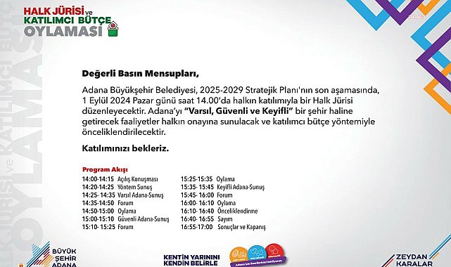 (ADANA) - Adana Büyükşehir Belediyesi, 2025-2029 Stratejik Planı’nın son aşamasında 1 Eylül 2024 Pazar günü 14.00 ile 17.00 saatleri arasında “Halk Jürisi” toplayacak. Adana Büyükşehir Belediye Başkanı Zeydan Karalar’ın seçim taahhütlerinden yola çıkarak Adana’yı “varsıl, güvenli ve keyifli” kılacak faaliyetler, önce belediyenin tüm birimleri ile yapılan görüşmelerle belirlendi. Ortaya çıkan 2025-2029 Stratejik Planı’nı iki farklı çalıştayda meslek kuruluşları, akademisyenler, sivil toplum kuruluşu temsilcileri ve basın mensupları ile tartışmaya açıldı. Çalıştaylar ve yapılan çevrimiçi anketlerle geliştirilen taslağın nihai hali gelecek ay Belediye Meclis gündemine gelmeden önce, 1 Eylül 2024 Pazar günü 14.00 ile 17.00 saatleri arasında halkın onayına sunulacak. Bağımsız, uzman bir kuruluş tarafından yaş, cinsiyet, meslek ve coğrafi temsil gözetilerek tamamen tesadüfi olarak belirlenen jüri üyeleri stratejik plan taslağını oylayacak. Halk Jürisi; taslak planın faaliyetlerini daha sonra katılımcı bütçe yöntemi kullanarak önceliklendirecek.