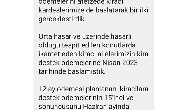 “6 Şubat Depremlerinin büyüklüğü ve etkisi dikkate alınarak daha önceki hiçbir deprem afetinde kiracılara yapılmayan kira destek ödemelerini afetzede kiracı kardeşlerimize de başlatarak bir ilki gerçekleştirdik. Orta hasar ve üzerinde hasarlı olduğu tespit edilen konutlarda ikamet eden kiracı ailelerimizin kira destek ödemelerine Nisan 2023 tarihinde başlamıştık. 12 ay ödemesi planlanan kiracılara destek ödemelerinin 15'inci ve sonuncusunu Haziran ayında yaparak tamamlayacağız. Allah milletimizi ve devletimizi her turlu afetten korusun."