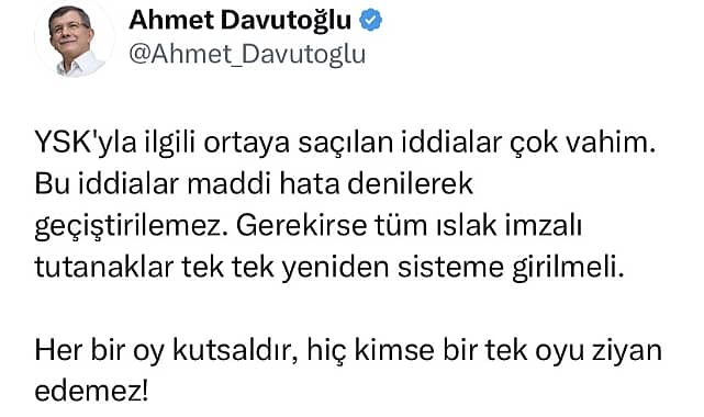 Gelecek Partisi Genel Başkanı Ahmet Davutoğlu, "YSK'yla ilgili ortaya saçılan iddialar çok vahim. Bu iddialar maddi hata denilerek geçiştirilemez. Gerekirse tüm ıslak imzalı tutanaklar tek tek yeniden sisteme girilmeli. Her bir oy kutsaldır, hiç kimse bir tek oyu ziyan edemez" dedi.Gelecek Partisi Genel Başkanı Ahmet Davutoğlu, ıslak imzalı sandık tutanakları ile uyuşmayan YSK verileri hakkında Twitter’dan açıklama yaptı. Davutoğlu, "YSK'yla ilgili ortaya saçılan iddialar çok vahim. Bu iddialar maddi hata denilerek geçiştirilemez. Gerekirse tüm ıslak imzalı tutanaklar tek tek yeniden sisteme girilmeli. Her bir oy kutsaldır, hiç kimse bir tek oyu ziyan edemez!"