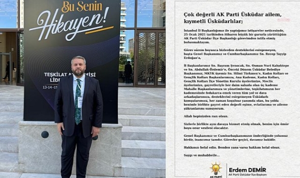 İSTANBUL) - AK Parti Üsküdar İlçe Başkanı Erdem Demir görevinden istifa ettiğini duyurdu. AK Parti Üsküdar İlçe Başkanı Erdem Demir, X hesabından yaptığı yazılı açıklama ile görevinden istifa ettiğini bildirdi. İstifa kararının AKP İstanbul İl Başkanlığı ile istişare sonunda alındığını söyleyen Erdem'in yazılı açıklamasında şu ifadeler yer aldı: "Çok değerli AK Parti Üsküdar ailem, kıymetli Üsküdarlılar;