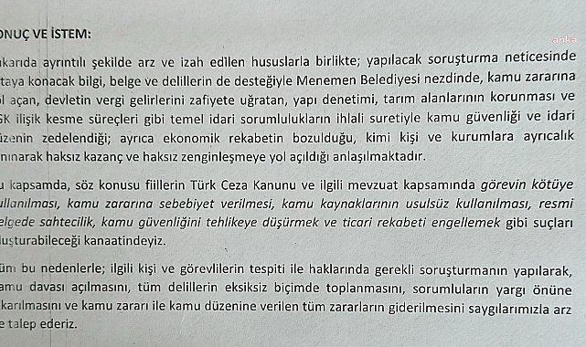 (İZMİR) - Menemen Belediye Meclisinin 9 CHP’li üyesi, 2022–2025 yılları arasında belediye tarafından düzenlenen inşaat ruhsatlarında usulsüzlük yapıldığı iddiasıyla suç duyurusunda bulundu.CHP'li Menemen Belediye Meclisi üyelerinin Menemen Cumhuriyet Başsavcılığına verdiği suç duyurusu dilekçesinde, belediye tarafından düzenlenen inşaat ruhsatlarıyla "haksız kazanç sağlandığı" ve "kamu zararına neden olunduğu" ifade edildi.Dilekçede şunlar kaydedildi:“Menemen Belediyesinde 2022–2025 arasında gerçekleştirilen imar uygulamaları kapsamında görevi ihmal ve görevi kötüye kullanma, kamu kurum ve kuruluşlarını zarara uğratma, İmar Kanunu, Planlı Alanlar İmar Yönetmeliği ve eklerine aykırı işlemler, haksız kazanç ve zenginleşme, Türk Ticaret Kanunu'na aykırılık, haksız rekabet, Vergi Usul Kanunu ile Belediye Gelirleri Kanunu'na aykırılık suretiyle belediyenin zarara uğratıldığına ilişkin iddialar hakkında sorumluların tespiti ve kamu davası açılması talebimizdir.”"Görevin kötüye kullanılması gibi suçları oluşturabileceği kanaatindeyiz"Dilekçede, bazı müteahhit firmalardan yasal harçlar alınmadığı, bazılarından ise yüksek oranda harçlar alındığı savunularak, "Menemen Belediyesi nezdinde, kamu zararına yol açan, devletin vergi gelirlerini zafiyete uğratan, yapı denetimi, tarım alanlarının korunması ve SGK ilişik kesme süreçleri gibi temel idari sorumlulukların ihlali suretiyle kamu güvenliği ve idari düzenin zedelendiği, ayrıca ekonomik rekabetin bozulduğu, kimi kişi ve kurumlara ayrıcalık tanınarak haksız kazanç ve haksız zenginleşmeye yol açtığı anlaşılmaktadır" denildi.Dilekçede, yapılacak soruşturmalar sonucunda şüpheliler hakkında kamu davası açılması talep edildi.