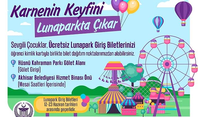 Akhisar Belediye Başkanı Besim Dutlulu, karne heyecanı yaşayacak öğrencilere ücretsiz lunapark giriş bileti dağıtımına başladıklarını açıkladı. Başkan Dutlulu, cuma günü karnesini alan tüm çocukları Hüsnü Kahraman Kültür Parkı’nda bulunan Akhisar Lunapark’a davet etti. Akhisar’da yaklaşık 30 bin öğrenci karne heyecanı yaşayacak. Başkan Dutlulu’nun talimatıyla harekete geçen belediye ekipleri, karne sevinci yaşayacak öğrenciler için kolları sıvadı ve çocuklara ücretsiz lunapark giriş bileti dağıtımına başladı. Karnesini alacak çocuklara jest yapmak istediklerini belirten Başkan Dutlulu, şunları söyledi:“Bugün itibarıyla Akhisarlı öğrencilerimize karne hediyesi olarak ücretsiz lunapark giriş bileti dağıtmaya başladık. Onlara sürpriz yapmak istedik. Bu yaz tatilinde aileleri ile birlikte doyasıya eğlensinler istedik. Halkla İlişkiler Müdürlüğü’müze bağlı ekip arkadaşlarımız hem merkezde hem de kırsal mahallelerdeki öğrencilerimize ücretsiz lunapark giriş biletlerini dağıtıyor. Belediye hizmet binası önü ve Hüsnü Kahraman Kültür Parkı girişindeki bilet dağıtım noktalarından çocuklarımız ücretsiz biletlerini alabilirler. Bunu yanı sıra muhtarlıklarına giderek veya belediyemize gelerek de biletlerini alabilirler. Biz, Akhisar Belediyesi olarak her zaman halkımızın yanında olmaya ve onlar için çalışmaya devam edeceğiz.”