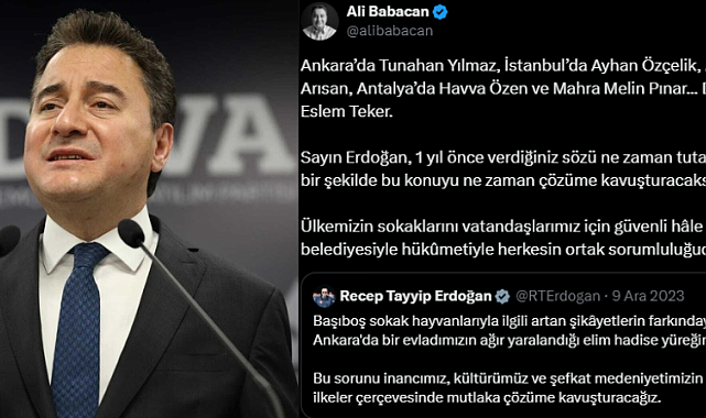 (ANKARA) - DEVA Partisi Genel Başkanı Ali Babacan, Hakkari'de sahipsiz köpeklerin saldırısı sonucu hayatını kaybeden Eslem Teker üzerinden Cumhurbaşkanı Recep Tayyip Erdoğan'a seslendi. Babacan, Erdoğan'ın 1 yıl önce yaptığı açıklamayı anımsatarak "Vicdanlı bir şekilde bu konuyu ne zaman çözüme kavuşturacaksınız?" diye sordu.DEVA Partisi Genel Başkanı Ali Babacan, Cumhurbaşkanı Recep Tayyip Erdoğan'a seslendi. Sokak köpekleri üzerinden Erdoğan'ın "Başıboş sokak hayvanlarıyla ilgili artan şikayetlerin farkındayız. Bu sorunu inancımız, kültürümüz ve şefkat medeniyetimizin bize vazettiği ilkeler çerçevesinde mutlaka çözüme kavuşturacağız" sözlerini hatırlatan Babacan, yaptığı paylaşımda şu ifadelere yer verdi: "Ankara’da Tunahan Yılmaz, İstanbul’da Ayhan Özçelik, Adana’da Şerife Arısan, Antalya’da Havva Özen ve Mahra Melin Pınar. Dün de Hakkari’de Eslem Teker. Sayın Erdoğan 1 yıl önce verdiğiniz sözü ne zaman tutacaksınız, vicdanlı bir şekilde bu konuyu ne zaman çözüme kavuşturacaksınız?Ülkemizin sokaklarını vatandaşlarımız için güvenli hale getirmek belediyesiyle hükümetiyle herkesin ortak sorumluluğudur."