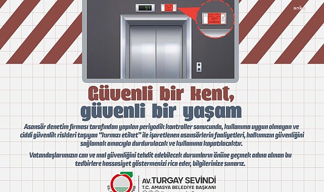 (AMASYA)- Amasya Belediyesi, kentte güvenlik açısından risk taşıyan asansörleri kullanıma kapatacak. Belediye Başkanı Turgay Sevindi, "Vatandaşlarımızın can ve mal güvenliğini tehdit edebilecek durumların önüne geçmek adına alınan bu tedbirlere hassasiyet göstermenizi rica eder, bilgilerinize sunarız" dedi.Amasya Belediye Başkanı Turgay Sevindi, asansör denetim firması tarafından yapılan periyodik kontroller sonucunda kullanıma uygun olmayan ve güvenlik açısından risk taşıyan asansörlerin faaliyetlerinin durdurulacağını söyledi.Belediye’nin sosyal medya hesabından yapılan açıklamada da “kırmızı etiket” ile işaretlenen asansörlerin faaliyetlerinin halkın güvenliğini sağlamak amacıyla durdurulacağı ve kullanıma kapatılacağı belirtildi.Belediye Başkanı Turgay Sevindi, “Vatandaşlarımızın can ve mal güvenliğini tehdit edebilecek durumların önüne geçmek adına alınan bu tedbirlere hassasiyet göstermenizi rica eder, bilgilerinize sunarız” diye konuştu.