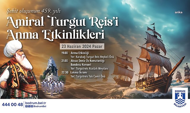 (MUĞLA) - Amiral Turgut Reis, ölümünün 459. yılında Bodrum Belediyesi tarafından düzenlenecek etkinliklerle anılacak.Bodrum Belediyesi Kültür ve Sosyal İşler Müdürlüğü organizasyonuyla 23 Haziran Pazar günü saat 19.00’da Karabağ Mahallesi Turgutreis Heykeli önünde “Amiral Turgutreis’i Anma Töreni” yapılacak. Aynı gün saat 21.00’de ise Turgutreis Atatürk Meydanında AKSAZ Deniz Üs Komutanlığı Bandosu tarafından “Amiral Turgutreis’i Anma Konseri” düzenlenecek.Turgut Reis’i anma etkinlikleri kapsamında Deniz Kuvvetleri Komutanlığı'na bağlı TCG Karaburun, 23 Haziran Pazar günü 10.00-17.00 saatleri arasında Turgutreis Limanı'nda ziyarete açılacak.