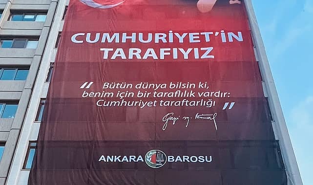 Ankara Barosu, Yüksek Seçim Kurulu yakınlarındaki binasına “Cumhuriyet’in Tarafıyız” yazılı pankartı astı.Ankara Barosu, oy sayım işlemleri devam ederken Yüksek Seçim Kurulu binasının yakınlarındaki merkez binasına “Cumhuriyet’in Tarafıyız” yazılı pankart astı. Baroya asılan pankartta, Gazi Mustafa Kemal Atatürk’ün “Bütün dünya bilsin ki, benim için bir taraflılık vardır; Cumhuriyet taraflılığı” sözleri yer aldı.