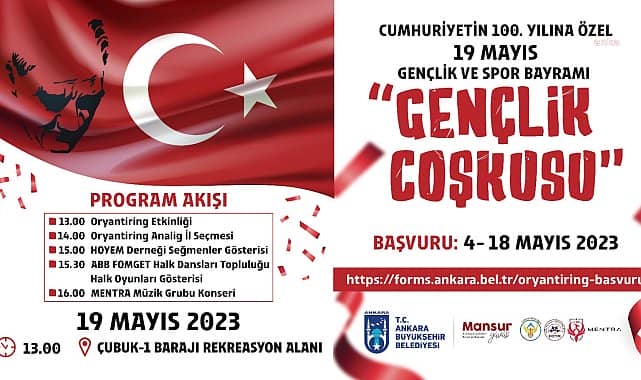 Ankara Büyükşehir Belediyesi (ABB), 19 Mayıs Gençlik ve Spor Bayramı’nda, Çubuk-1 Barajı Rekreasyon Alanı’nda ‘Gençlik Coşkusu’ ismiyle oryantiring etkinliği düzenleyecek. Ankara Büyükşehir Belediyesi, Gazi Mustafa Kemal Atatürk’ün gençlere armağan ettiği 19 Mayıs Gençlik ve Spor Bayramı’nı Başkentlilerin coşkuyla kutlaması için bir dizi etkinliğe ev sahipliği yapacak.ABB Kadın ve Aile Hizmetler Daire Başkanlığı, Çubuk-1 Barajı Rekreasyon Alanı’nda ‘Gençlik Coşkusu’ ismiyle oryantiring etkinliği düzenleyecek. Konser ve dans gösterilerinin de yer alacağı etkinliğe katılmak isteyen gençler, 4-18 Mayıs 2023 tarihleri arasında https://forms.ankara.bel.tr/oryantiring-basvuru adresindeki formu doldurarak başvuruda bulunabilecek.