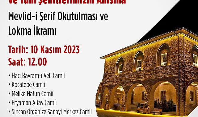 Ankara Büyükşehir Belediyesi, 10 Kasım 2023 günü Cumhuriyet'in kurucusu Gazi Mustafa Kemal Atatürk ve şehitlerin anısına merkez ilçelerdeki camilerde mevlit okutup lokma dağıtacak.