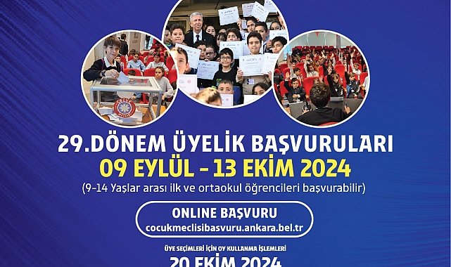 (ANKARA)- Ankara Büyükşehir Belediyesi Çocuk Meclisi yeni dönem başvuruları başlıyor. 9-14 yaş arası ilk ve ortaokul öğrencilerin 9 Eylül-13 Ekim arasında başvuruda bulunabilecekleri Çocuk Meclisi’nde 29. Dönem üyeleri 20 Ekim 2024 tarihinde gerçekleştirilecek seçimle belirlenecek.Başkentli çocukların, katılımcı bir anlayışla, görüşlerini, fikirlerini ve çözüm önerilerini özgürce ifade edebildikleri, tavsiye kararı alarak çocuk haklarını öğrendikleri Ankara Büyükşehir Belediyesi Çocuk Meclisi’nin yeni dönem başvuru süreci başlıyor. Yaşadığı alanları güzelleştirmek için taleplerini ifade etmelerinde ve çözüm yolları bulmalarında aktif rol almalarını amaçlayan Çocuk Meclisi’nin 9 Eylül'de başlayan başvuru süreci 13 Ekim’de sona erecek ve Çocuk Meclisi’nin yeni dönem üyeleri 20 Ekim 2024 tarihinde yapılacak seçimle belirlenecek.Başvurular online yapılabilecek9 Eylül–13 Ekim arasında, ilk ve ortaokula devam eden 9 - 14 yaş arası çocuklar, 'https://cocukmeclisibasvuru.ankara.bel.tr/' adresine online başvuru yapabilecek. Formda yer alan açıklamalara uygun olarak, '[email protected]' adresine bir dakikayı geçmeyecek şekilde aday tanıtım videolarını gönderebilecek.29. Dönem Çocuk Meclisi, 20 Ekim 2024 tarihinde gerçekleşecek olan seçimin ardından görevine başlayacak.