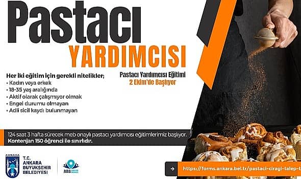 Ankara Büyükşehir Belediyesi’nin (ABB) istihdama katkı sağlayan projesi devam ediyor. ABB Kariyer Merkezi tarafından düzenlenen Pastacı Yardımcısı eğitimleri 2 Ekim 2023 tarihinde, Aşçı Yardımcısı eğitimleri ise 28 Ağustos’ta başlayacak.Ankara Büyükşehir Belediyesi, Başkent’te istihdama katkı sağlayacak projeleri tek tek hayata geçirmeye sürdürüyor. Bu kapsamda ABB Kariyer Merkezi, aşçı yardımcısı ve pastacı yardımcısı eğitimleri için kolları sıvadı. 178 saat 5 hafta sürecek Aşçı Çırağı Eğitimi ile 124 saat 3 hafta sürecek Pastacı Çırağı Eğitimi için başvurular başladı.Başkent’te istihdama katkı sağlaması amacıyla başlatılan eğitimlere https://forms.ankara.bel.tr/asci-ciragi-talep-toplama ve https://forms.ankara.bel.tr/pastaci-ciragi-talep-toplama adresi üzerinden çevrim içi başvuru yapılabilecek.Pastacı yardımcısı eğitiminde kontenjan 150, aşçı yardımcısı eğitiminde ise kontenjan 200 kişi ile sınırlandırıldı. 178 saat 5 hafta sürecek Aşçı Çırağı Eğitimi ile 124 saat 3 hafta sürecek Milli Eğitim Bakanlığı (MEB) onaylı Pastacı Çırağı Eğitimi için gerekli nitelikler ise şöyle:“-18-35 yaş aralığında,-Aktif olarak çalışmıyor olmak,-Engel durumu olmayan,-Adli sicil kaydı bulunmayan.”
