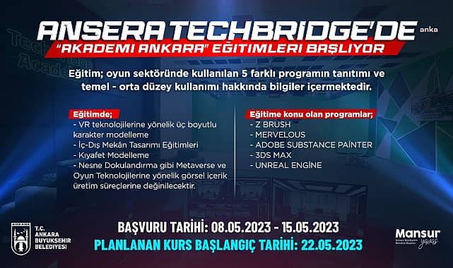 Ankara Büyükşehir Belediyesi’nin (ABB) ‘Oyun ve Metaverse Teknolojileri Tasarım Eğitimi’ yeniden başlıyor. ABB Bilgi İşlem Daire Başkanlığı, Ansera TechBridge’de, Akademi Ankara adı altında ‘Oyun ve Mataverse Teknolojileri Tasarım Eğitimi’ni yeniden başlatıyor. Eğitimlere katılmak isteyen bilişim meraklıları, 15 Mayıs Pazartesi gününe kadar eğitimlere çevrim içi olarak başvuruda bulunabilecek.5 FARKLI PROGRAMEğitim kapsamında; Metaverse, oyun teknolojileri ve VR teknolojilerine yönelik üç boyutlu karakter modelleme, kıyafet modelleme, nesne dokulandırma, iç-dış mekan tasarımı gibi dersler verilecek. Eğitim süresince oyun sektöründe dünyanın her bölgesinde bu sektörde çalışan uzmanlar tarafından kullanılan; Z Brush, Mervelous, Adobe Substance Painter, 3ds Max Ve Unreal Engine isimli 5 farklı programın temel ve orta düzeyde kullanımı anlatılacak.SON BAŞVURU 15 MAYISHafta içi her gün 08.30-17.30 saatleri arasında verilecek eğitimleri katılmak isteyenler, 15 Mayıs 2023 Pazartesi gününe kadar https://akademi.ankara.bel.tr/kurs-detay/oyun_ve_metaverse_tasarim_egitimi adresi üzerinden programa, çevrim içi olarak başvuruda bulunabilecek. Kontenjanın sınırlı olduğu eğitimin başlangıç tarihi ise 22 Mayıs 2023 olarak belirlendi.
