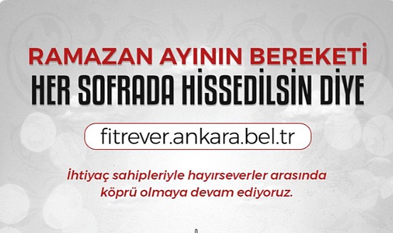 Ankara Büyükşehir Belediyesi, ihtiyaç sahibi vatandaşlara Ramazan ayında destek olmak amacıyla “Ramazan ayının bereketi her sofrada hissedilsin diye ihtiyaç sahipleriyle hayırseverler arasında köprü olmaya devam ediyoruz” sloganıyla ‘Fitre Ver’ ve ‘Fidye Ver’ kampanyalarını başlattı.