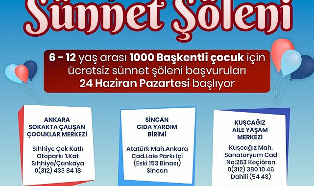 (ANKARA)- Ankara Büyükşehir Belediyesi'nin ‘Toplu Sünnet Şöleni’ için kayıtlar, 24 Haziran Pazartesi günü başlıyor. Bin Başkentli çocuğun ücretsiz olarak sünnet ettirileceği şölende, sünnet kıyafetleri de Büyükşehir Belediyesi tarafından karşılanacak.Ankara Büyükşehir Belediyesi'nin, geleneksel hâle getirdiği Toplu Sünnet Şöleni için başvuru süreci başlıyor. Büyükşehir Belediyesi, bu yıl 6-12 yaş arasındaki bin Başkentli çocuğu ücretsiz sünnet ettirecek.Toplu Sünnet Şöleni için 24 Haziran Pazartesi gününden itibaren ailelerin başvuruları alınmaya başlanacak. Ebeveynler, kayıt için Büyükşehir Belediyesi, Sokakta Çalışan Çocuklar Merkezi, Kuşcağız Aile Yaşam Merkezi ve Sincan Gıda Yardım Birimi’ne başvuru yapabilecek.'(0312) 507 23 17-18' numaralı telefondan detaylı bilgi alabilecek olan ebeveynler, kendilerine en yakın merkezde kayıt yaptırabilecek.Büyükşehir Belediyesi, kayıt sürecinin tamamlanmasının ardından çocukların sünnet kıyafetlerini karşılayacak. Ayrıca çocuklara çeşitli sürpriz hediyeler de dağıtılacak.