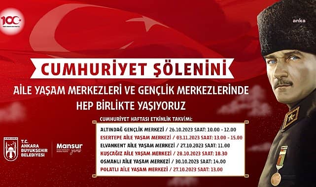 Cumhuriyet Haftası etkinlikleri kapsamında; Kadın ve Aile Hizmetleri Daire Başkanlığına bağlı Aile Yaşam Merkezleri ile Gençlik Merkezlerinde “Cumhuriyet Şenliği” düzenlenecek. Şenlikte; kültür, sanat ve eğlence içerikli müzik, resim, dans ve birçok farklı sanatsal dalda etkinlikler gerçekleştirilecek.