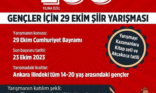 Ankara’da yaşayan gençlerin sanata teşvik edilmesi amacıyla düzenlenen 29 Ekim Cumhuriyet Bayramı temalı şiir yarışmasında katılımcılara ait şiirler, dil, üslûp, anlatım ve estetik yönünden değerlendirilecek ve 6 kazanan belirlenecek.