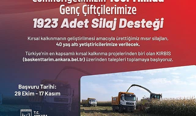 Ankara Büyükşehir Belediyesi, “Cumhuriyetimizin 100’üncü yılında 1923 adet mısır silajı desteği” sloganıyla BAKAP Tarım Kampüsü ve Rekreasyon Alanı’nda yetiştirilerek paketlenen mısır silajlarını 40 yaş ve altı yetiştiricilere dağıtacak. 29 Ekim’de başlayacak başvurular, 17 Kasım’a kadar “baskenttarim.ankara.bel.tr” adresi üzerinden yapılabilecek.