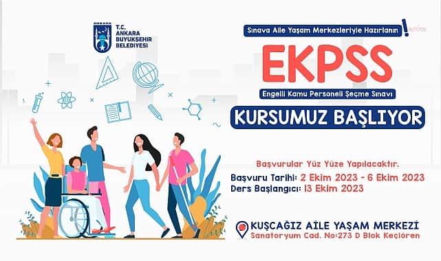 Ankara Büyükşehir Belediyesi Kadın ve Aile Hizmetleri Daire Başkanlığı tarafından eğitimde fırsat eşitliği sağlamak amacıyla başlatılan ücretsiz Yükseköğretim Kurumları Sınavı (YKS) ve Ortaöğretim Engelli Kamu Personeli Seçme Sınavına (EKPSS) kurs başvuruları 2-6 Ekim 2023 tarihleri arasında Kuşcağız Aile Yaşam Merkezi’nde başlıyor.