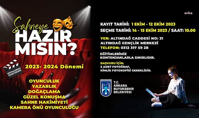 Ankara Büyükşehir Belediyesi Altındağ Gençlik Merkezi’nin, konservatuara hazırlanan öğrencilere destek olmak ve sahneyle buluşmak isteyen vatandaşlara yönelik başlattığı “Sahneye Hazır Mısın?” projesi bu yıl da devam ediyor. 1-12 Ekim 2023 tarihleri arasında ücretsiz ön kayıtların alınacağı projeye, 14 yaş ve üzeri tüm vatandaşlar başvuruda bulunabilecek. 14-15 Ekim günlerinde ise Altındağ Gençlik Merkezi'nde tiyatro oyunculuğu, doğaçlama, güzel konuşma, sahne hâkimiyeti ile şan (müzik) alanlarında değerlendirme sınavı yapılacak.