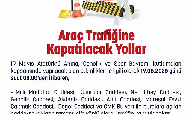 Ankara Emniyet Müdürlüğünden yapılan yazılı açıklamaya göre, 19 Mayıs Atatürk'ü Anma Gençlik ve Spor Bayramı etkinlikleri kapsamında, yarın saat 08.00'dan itibaren Milli Müdafaa Caddesi, Kumrular Caddesi, Necatibey Caddesi, Gençlik Caddesi, Anıt Caddesi, Mareşal Fevzi Çakmak Caddesi, Dögol Caddesi ve Gazi Mustafa Kemal (GMK) Bulvarı ile buralara açılan cadde ve sokakların tamamı çift yönlü olarak trafiğe kapalı olacak.