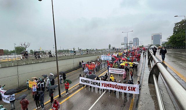 Ankara'da yağmur altında ellerinde taleplerini dile getiren dövizlerle yürüyen emekçiler, "Her Yer Taksim Her Yer Direniş", "Bu Daha Başlangıç Mücadeleye Devam" sloganları atarak meydana ilerliyor.