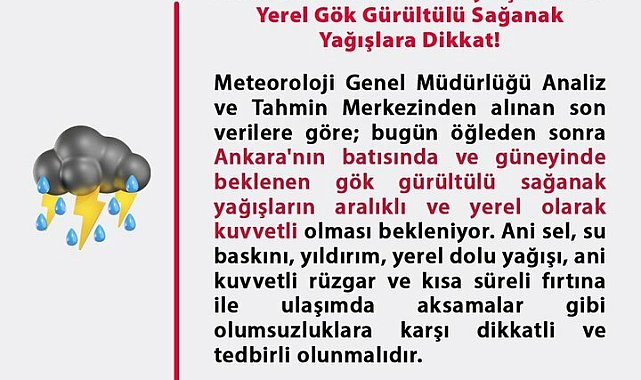 (ANKARA) - Ankara Valiliği tarafından yapılan meteorolojik uyarıya göre bugün öğleden sonra Ankara'nın batı ve güney ilçelerinde kuvvetli sağanak yağış bekleniyor. Ankara Valiliği tarafından "meteorolojik uyarı"da bulunuldu. Valiliğin sosyal medya hesabından yapılan açıklamada, "Ankara'nın batı ve güney ilçelerinde yerel gök gürültülü sağanak yağışlara dikkat. Meteoroloji Genel Müdürlüğü Analiz ve Tahmin Merkezinden alınan son verilere göre, bugün öğleden sonra Ankara'nın batısında ve güneyinde beklenen gök gürültülü sağanak yağışların aralıklı ve yerel olarak kuvvetli olması bekleniyor. Ani Sel, su baskını, yıldırım, dolu yağışı, rüzgar ve kısa süreli fırtına ile ulaşımda aksamalar gibi olumsuzluklara karşı dikkatli ve tedbirli olunmalıdır" ifadeleri yer aldı.