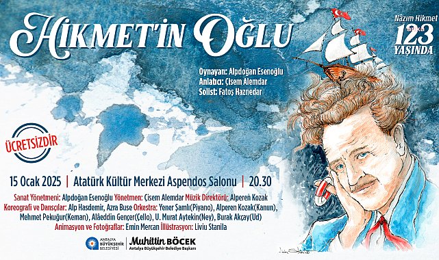 (ANTALYA)- Antalya Büyükşehir Belediyesi, Şair ve Yazar Nazım Hikmet'i doğumunun 123'üncü yılında Atatürk Kültür Merkezinde gerçekleşecek "Hikmet’in Oğlu" isimli müzikli gösteriyle anacak. Antalya Büyükşehir Belediyesi, edebiyat ve sanatseverler için unutulmaz bir geceye ev sahipliği yapmaya hazırlanıyor. Büyük şair Nâzım Hikmet, doğumunun 123'üncü yılında Antalya Büyükşehir Belediyesi tarafından anlamlı bir etkinlikle anılacak.Sanat yönetmenliğini Alpdoğan Esenoğlu’nun üstlendiği "Hikmet’in Oğlu" adlı müzikli gösteri, şairin yaşamını, aşklarını, mücadelesini sahneye taşıyacak. Nazım Hikmet’in eserlerinden bestelenmiş parçalardan oluşacak performans, 15 Ocak Çarşamba akşamı Atatürk Kültür Merkezi Aspendos Salonu’nda saat 20.30’da sahnelenecek. Etkinliğe tüm vatandaşlar ücretsiz olarak katılabilecek.