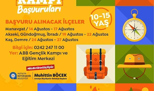 Antalya Büyükşehir Belediyesi, okullar açılıncaya kadar Gençlik Kampı ve Eğitim Merkezi’nde 10-15 yaş arası çocuk ve gençlere yönelik yaz ve çadır kampları düzenliyor.Antalya Büyükşehir Belediyesi Gençlik ve Spor Hizmetleri Dairesi Başkanlığı, Kepez ilçesinde yeni açtığı Gençlik Kampı ve Eğitim Merkezi’nde yaz ve çadır kampları düzenliyor. 10-15 yaş arası çocuk ve gençlere yönelik düzenlenecek olan kamplara öncelikle merkez ilçeler dışındaki ilçelerden katılımcı alınıyor. Antalya'da çocuk ve gençleri ekran ışığından, ağaç gölgesine taşıyarak; yaparak yaşayarak öğrenmelerini sağlamak için düzenlenen kamplar "Yaz Kampları" ve "Çadır Kampları" olarak iki farklı kamp olarak düzenleniyor. Ücretsiz olarak düzenlenen kamplarda ekip çalışması, yaratıcılık, yaratıcı drama gibi eğitimler, seramik, kolaj, resim, dans, müzik gibi atölyeler, havuz etkinlikleri ve geziler yer alıyor. 10-15 yaş arası çocuk ve gençlere yönelik düzenlenen kamplara başvurular http://genclikspor.antalya.bel.tr adresinden çevrim içi olarak yapılıyor. Daha fazla bilgi için 0242 247 11 00 numaralı telefondan Gençlik Kampı ve Eğitim Merkezi’ne ulaşılabilecek.