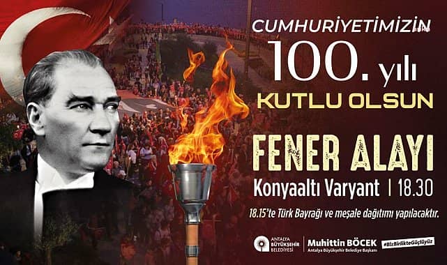 Antalya Büyükşehir Belediyesi, Cumhuriyet’in 100. yılını ünlü sanatçıların vereceği konserler ve fener alayıyla kutlayacak. Edip Akbayram 27 Ekim’de Demre’de, Sefo 28 Ekim’de Alanya’da ve 29 Ekim’de Antalya Cumhuriyet Meydanı’nda konserler verecek. Karaalioğlu Parkı ve İbradı ilçesinde de konserler düzenlenecek. 29 Ekim’de Konyaaltı Varyantı'nda fener alayı düzenlenecek. Antalya Büyükşehir Belediyesi, Cumhuriyet’in kuruluşunun 100’üncü yıl dönümünü büyük bir coşkuyla kutluyor. Büyükşehir Belediyesi, Cumhuriyet Bayramı etkinlikleri kapsamında 29 Ekim Pazar günü saat 18.30’da fener alayı düzenleyecek. Konyaaltı Varyant’tan başlayacak fener alayı Cumhuriyet Meydanı’nda son bulacak. 400 METRELİK TÜRK BAYRAĞI400 metrelik Türk bayrağı ve meşaleler eşliğinde gerçekleştirilecek fener alayı büyük bir coşkuyla gerçekleştirilecek. Fener alayının ardından saat 21.00’de Cumhuriyet Meydanı’nda Sefo konseri düzenlenecek. Ünlü sanatçı Sefo, Antalyalılara unutulmaz bir konser verecek. 500 DRONE İLE GÖSTERİKonser sonrasında Cumhuriyet Meydanı’nda 500 drone ile Cumhuriyet ve Atatürk görselleri eşliğinde muhteşem bir gösteri gerçekleştirilecek. Ardından havai fişek gösterisiyle Antalya semaları aydınlanırken, büyük bir coşku yaşanacak. EDİP AKBAYRAM DEMRE’DEÖte yandan, Cumhuriyet kutlamaları kapsamında 27 Ekim Cuma günü Demre Kekova Festivali’nde Demre Noel Baba Meydanı’nda ünlü sanatçı Edip Akbayram konseri gerçekleştirilecek. 28 Ekim Cumartesi saat 21.00’da Alanya Belediye arkasında ise Cumhuriyetin 100. Yılı Sefo konseri ve drone gösterisi yapılacak. 25-28 Ekim tarihleri arasında ise Karaalioğlu Parkı Orta Miradorda konserler ve etkinlikler gerçekleştirilecek. 29 Ekim’de İbradı ilçesinde de 100. Yıl Cumhuriyet konseri düzenlenecek.Antalya Büyükşehir Belediye Başkanı Muhittin Böcek, 29 Ekim Cumhuriyet Bayramı kutlamalarına tüm Antalyalıları davet etti.