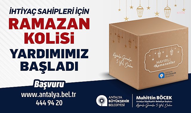 Antalya Büyükşehir Belediyesi'nin birlik, beraberlik ve dayanışmanın simgesi Ramazan ayında ihtiyaç sahiplerine dağıtacağı gıda kolisi yardımı için başvurular başladı.Sosyal belediyecilik anlayışıyla vatandaşlara hizmetini ve desteğini sürdüren Büyükşehir Belediyesi, paylaşma ve dayanışma ayı Ramazan’ın bereketini ihtiyaç sahibi vatandaşların sofrasına taşıyor. Bu kapsamda merkez ve 19 ilçede Ramazan ayı boyunca gıda kolisi desteği verilecek. GIDA PAKETİ İÇİN ONLINE BAŞVURUİhtiyaç sahibi vatandaşlar, Antalya Büyükşehir Belediyesi tarafından ABİM'in 444 94 20 telefonu ve www.antalya.bel.tr adresi üzerinde oluşturulan Ramazan Gıda Paketi Talep Formunu doldurarak başvuru yapabilecek. Gelir durumu ve muhtaçlık kriterlerine göre değerlendirme yapılıp ihtiyaç sahiplerine gıda kolisi desteği sağlanacak.
