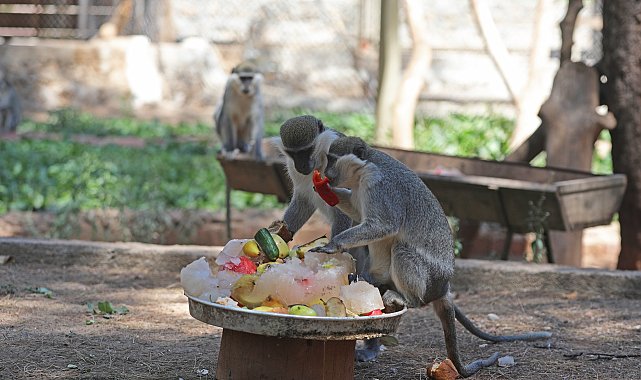 (ANTALYA)- Antalya Büyükşehir Belediyesi, Doğal Yaşam Parkı’ndaki hayvanları, sıcak havadan olumsuz etkilenmemeleri için buzlu meyve kokteylleri ve fıskiyeler ile serinletiyor.Antalya Büyükşehir Belediyesi Doğal Yaşam Parkı'nda bulunan bin 400'den fazla hayvan, kentte aniden yükselen hava sıcaklığından olumsuz etkilenmemeleri için özel olarak serinletiliyor.Hayvanlar, kafeslerindeki havuza giriyor, su fıskiyeleri ve buzlu meyve kokteyli ile ferahlıyor. Parktaki görevliler sıcaktan bunalan hayvanları özel hazırlanmış buz kalıpları içinde meyve ve sebze kokteylleri ile besliyor. Bozayıların, lemurların ve maymunların karpuz, portakal, kiraz, muz, elma gibi meyvelerden oluşan buzlu kokteyllerini yediği anlar ziyaretçilerin de ilgisini çekiyor. Doğal Yaşam Parkı'nda sıcaklara karşı ayrıca kafeslere konulan fıskiye sistemi, havuzlar, koyu gölgelik alanlar aracılığıyla da serinlemeleri sağlanıyor.Serinletici yaz diyeti uygulanıyorBüyükşehir Belediyesi Doğal Yaşam Parkı Şube Müdürü Veteriner Hekim Aygül Arsun, hayvanların sağlığını korumak için sıcaklar başlamadan tüm barınaklarda önlemlerin alındığını belirterek, "Gölgelik alanlar oluşturuluyor, fıskiye sistemi kontrol ediliyor, ihtiyaçlarına göre havuzlar yenilenip bakımları yapılıyor. Yaz aylarında hayvanlar için kalorisi düşük daha çok sulu meyve ve sebzelerden oluşan 'yaz diyeti' uyguluyoruz. Hayvanlar, hem sosyal olarak merak ve becerisini geliştiriyor hem de soğutulmuş yediği için serinliyor. Yaşam parkında bulunan bozayı ailesi, havuza girerek, kuşlar ise kafeslerindeki fıskiye sistemiyle serinliyor. Örneğin, lamaya sıcaklardan etkilenmemesi için yazlık tıraşını yaptık. Bazı türdeki hayvanların alışkanlıklarına göre çamur havuzları ile serinletme işlemi yapılıyor" dedi.