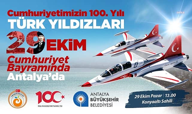 Antalya Büyükşehir Belediyesi’nin Cumhuriyet’in 100. yıl kutlamaları kapsamında Türk Hava Kuvvetleri'nin akrobasi timi "Türk Yıldızları", 29 Ekim’de Antalya semalarında gösteri yapacak.Türk Silahlı Kuvvetleri akrobasi timi Türk Yıldızları, Cumhuriyet Bayramı’nda Antalya semalarını renklendirecek. Büyükşehir Belediyesi’nin organize ettiği Cumhuriyet’in 100. yılı kutlamaları kapsamında Antalya’ya gelecek Türk Yıldızları, 29 Ekim Pazar günü saat 13.00’te dünyaca ünlü Konyaaltı sahili semalarında nefes kesen bir gösteri yapacak. Türk Yıldızları birbirinden heyecanlı ve adrenalin dolu gösterisiyle Antalyalılara 100. yıl coşkusunu yaşatacak. Antalya Büyükşehir Belediye Başkanı Muhittin Böcek, tüm Antalyalıları 29 Ekim’de Türk Yıldızları gösterisini izlemek üzere Konyaaltı sahiline davet etti.